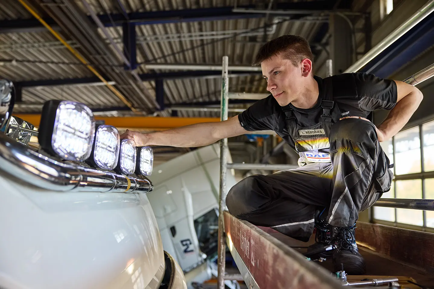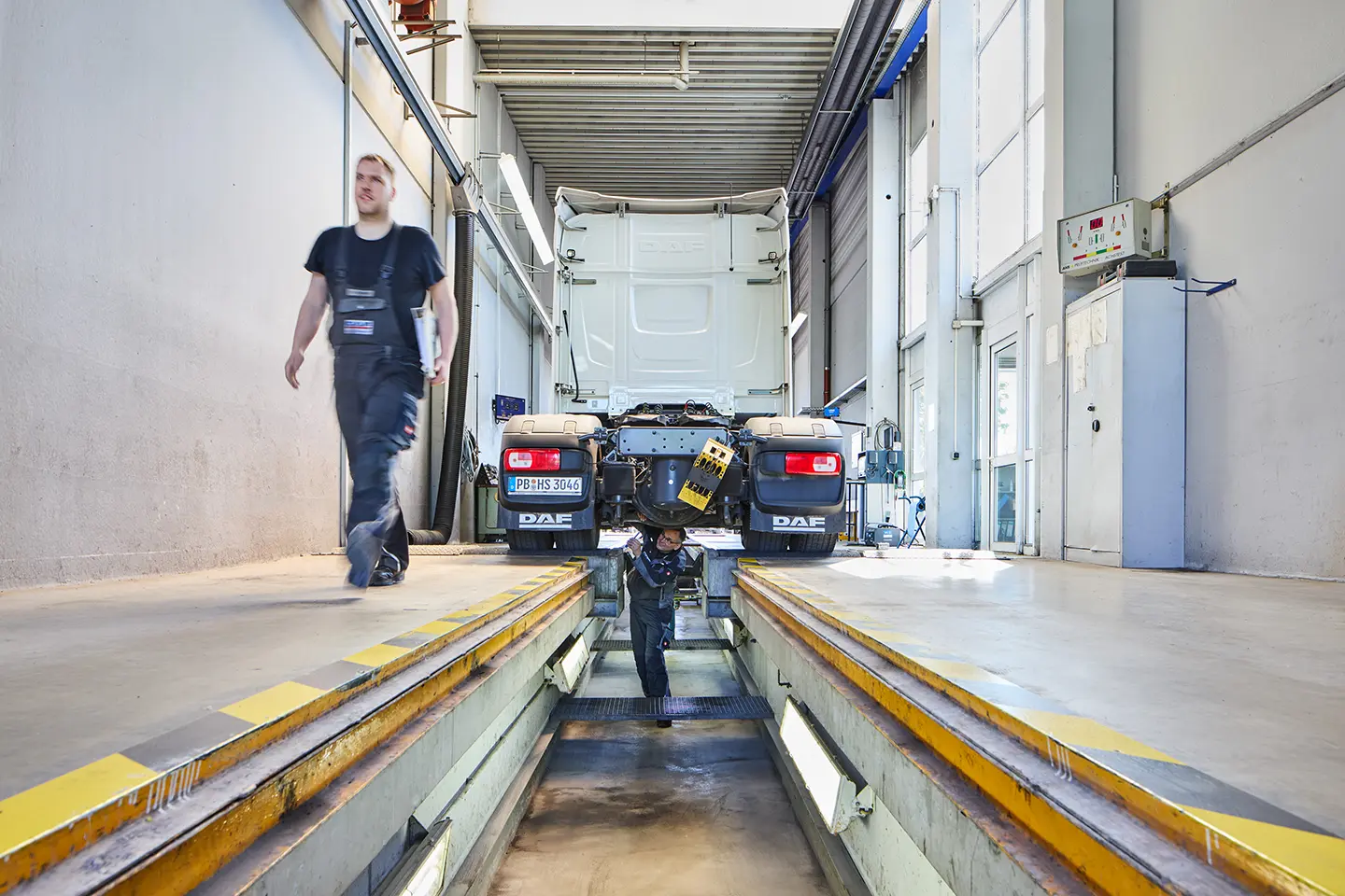 Ob DAF oder anderes Fabrikat – unsere acht Arbeitsbahnen und die moderne Prüfstraße bieten alles, was Ihr Lkw braucht: von der Spurvermessung bis zur Scheinwerfereinstellung. Alle Arbeiten führen wir fachgerecht, effizient und digital gestützt durch.